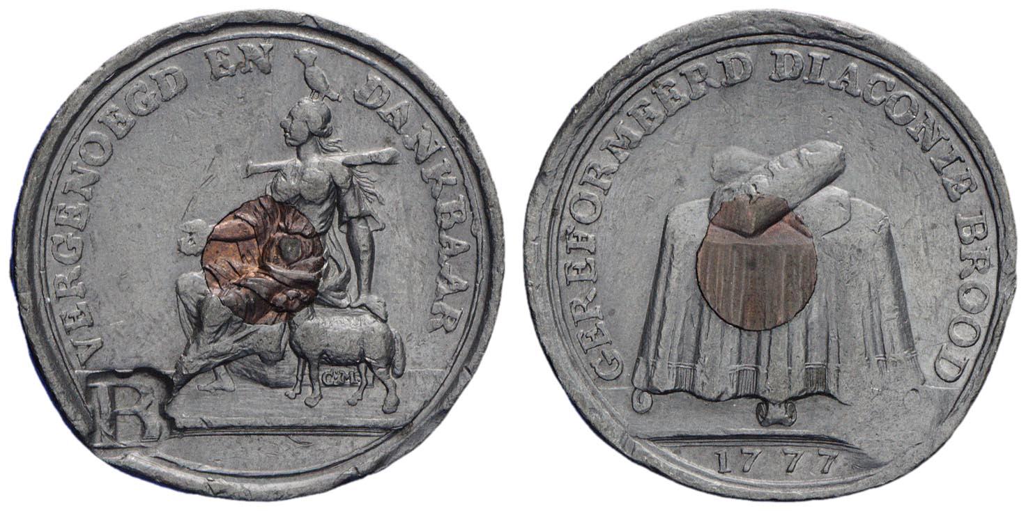 keerzijde: een tafel met gedrapeerd tafelkleed, daarop twee gekruiste broden waarop de letters DIA. Omschrift. Onder de afsnede een jaartal.