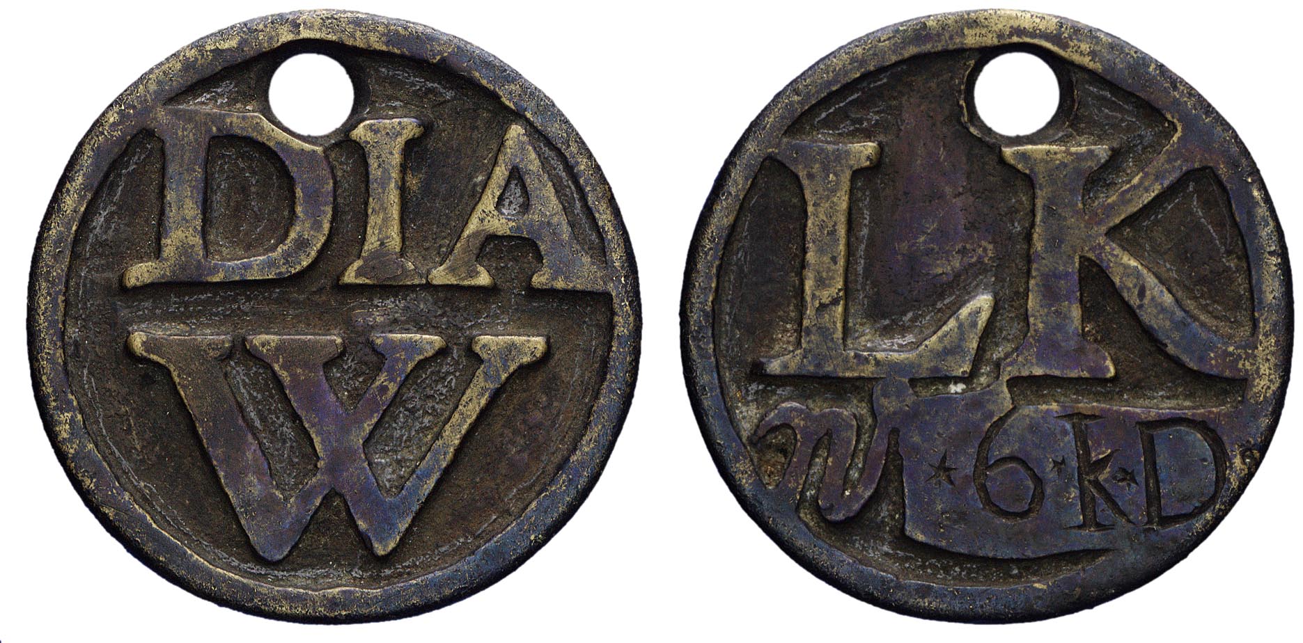 voorzijde: gegoten de letters DIA / W De penning is aan de bovenzijde doorboord. keerzijde: gegoten de letters LK / n°- Trefwoorden