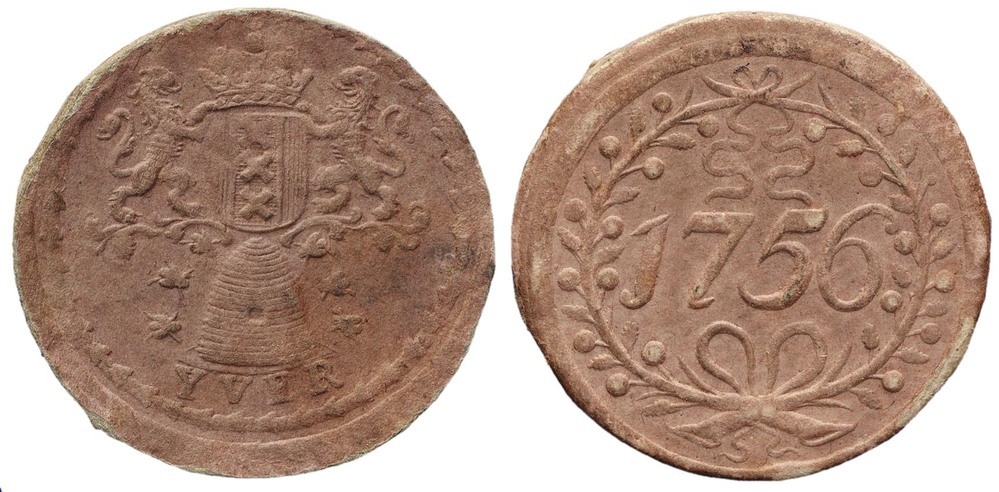 voorzijde: binnen een versierde rand het gekroonde wapen van Amsterdam door twee leeuwen gehouden, boven een bijenkorf. Daaronder een tekst. keerzijde: binnen een lauwerkrans met strik het jaartal 1756.