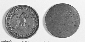voorzijde: vogel (duif) met omschrift. keerzijde: inscriptie met jaartal.- Trefwoorden
