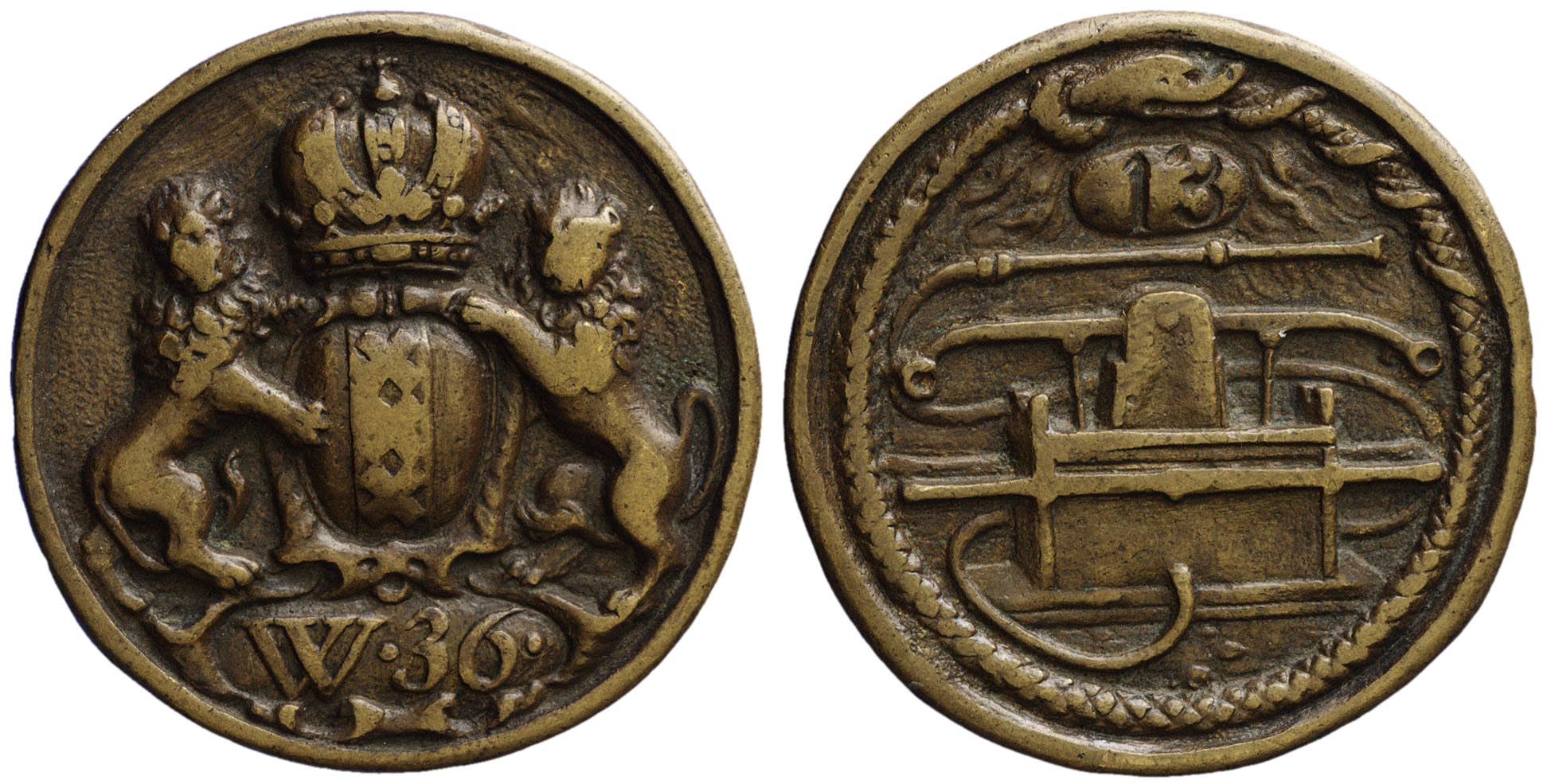 voorzijde: het gekroonde wapen van Amsterdam, gehouden door twee leeuwen. Onder het wapen een veld met W.36. keerzijde: een afbeelding van een brandspuit omgeven door een Ouroboros, bovenin een nummer.- Trefwoorden