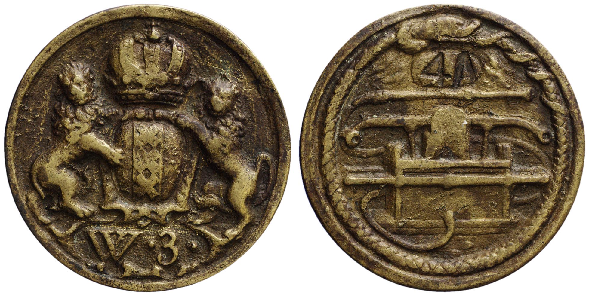voorzijde: het gekroonde wapen van Amsterdam, gehouden door twee leeuwen. Onder het wapen een veld met W.3.
