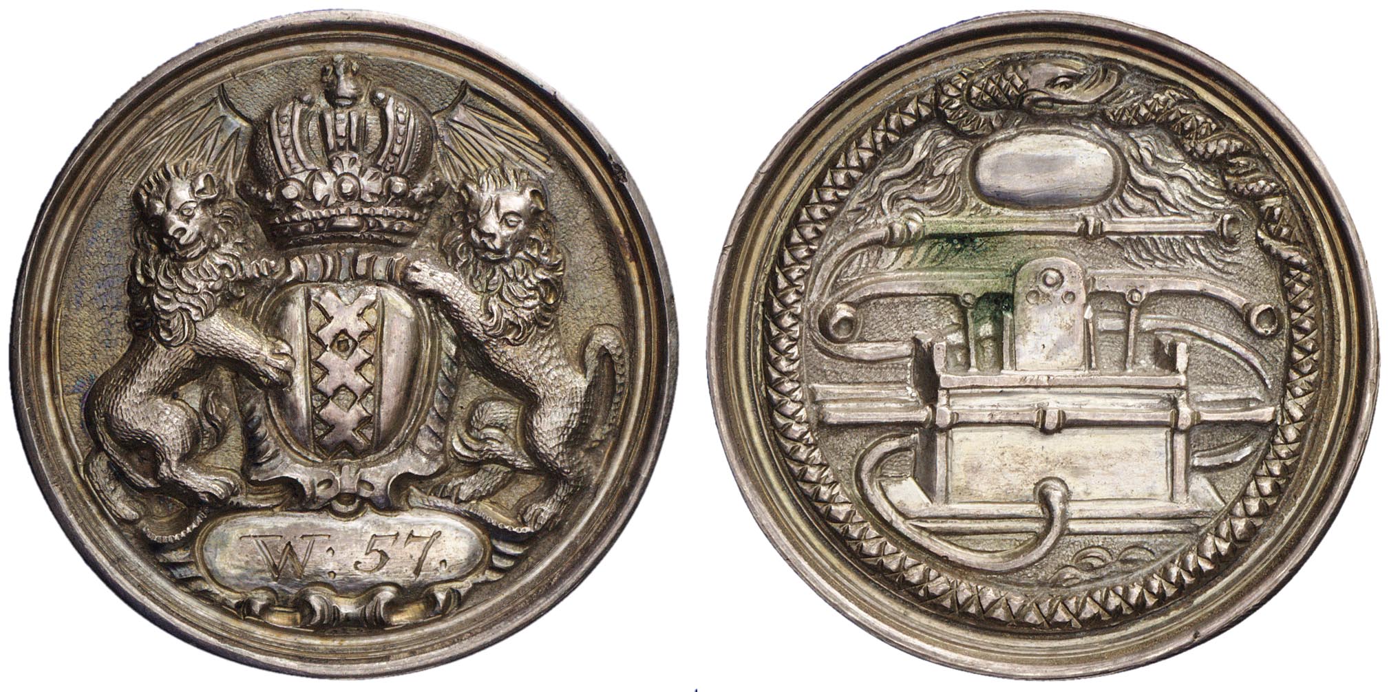 voorzijde: het gekroonde wapen van Amsterdam, gehouden door twee leeuwen. Onder het wapen een veld met W:57.