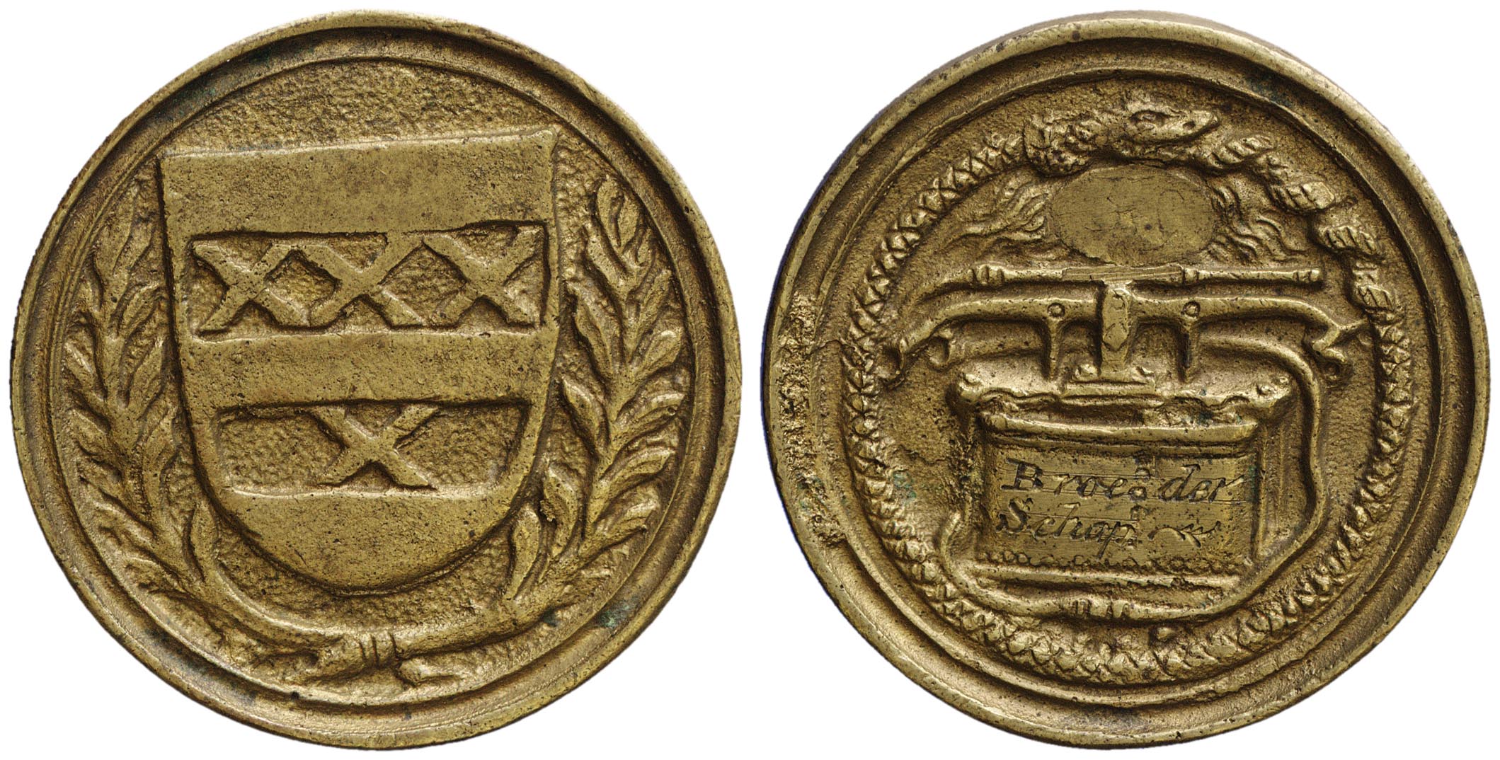 voorzijde: het wapen van Nieuwer Amstel met lauwertak. keerzijde: brandspuit, omgeven door een Ouroboros, bovenin een veld met inscriptie, op de brandspuit een inscriptie.- Trefwoorden
