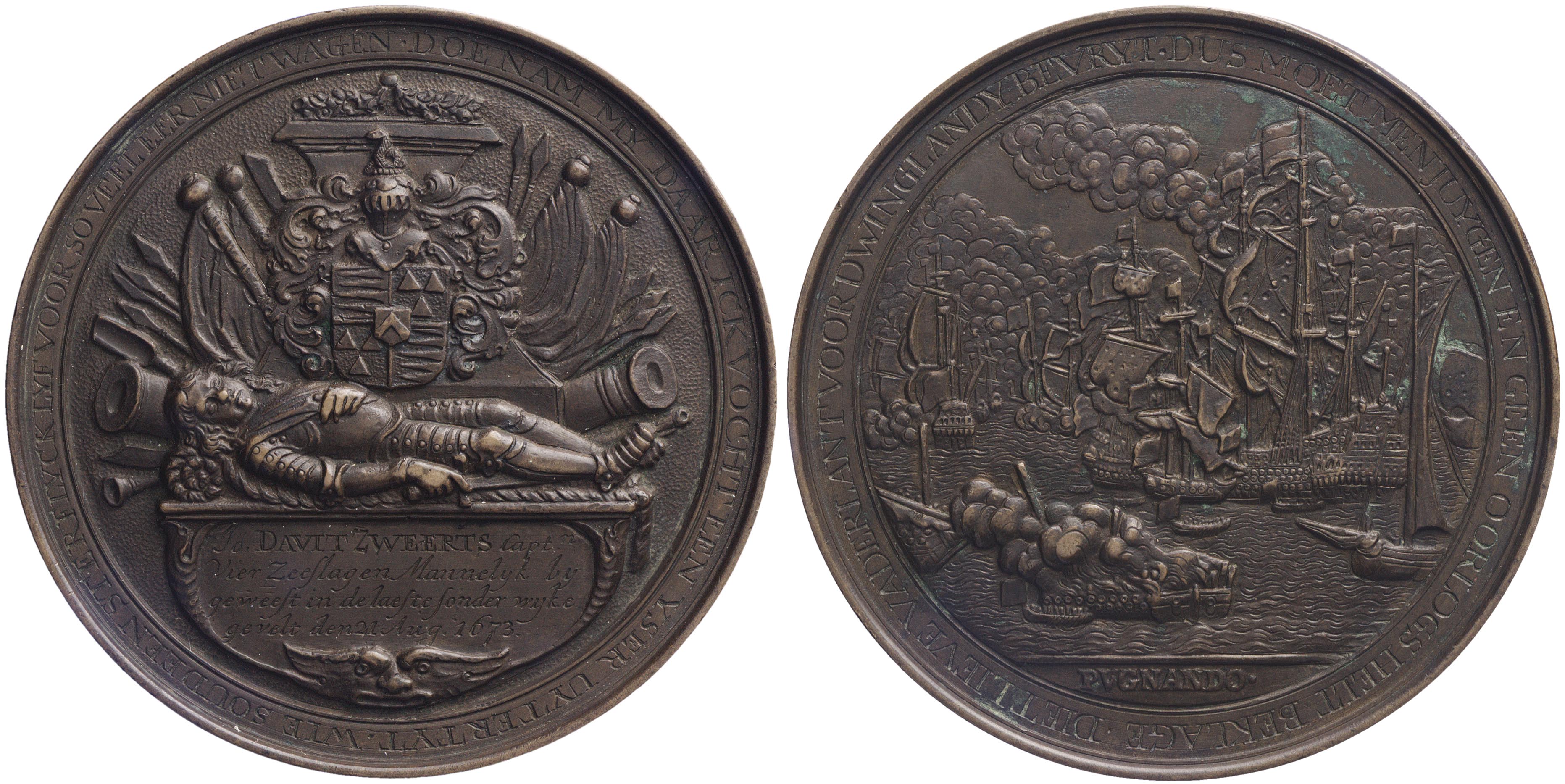 opschrift voorzijde: Jo: DAVIT ZWEERTS Capt. / Vier Zeeslagen Mannelijck by / geweest inden laetsten sonder wyke / gevelt den 21 Aug. 1673