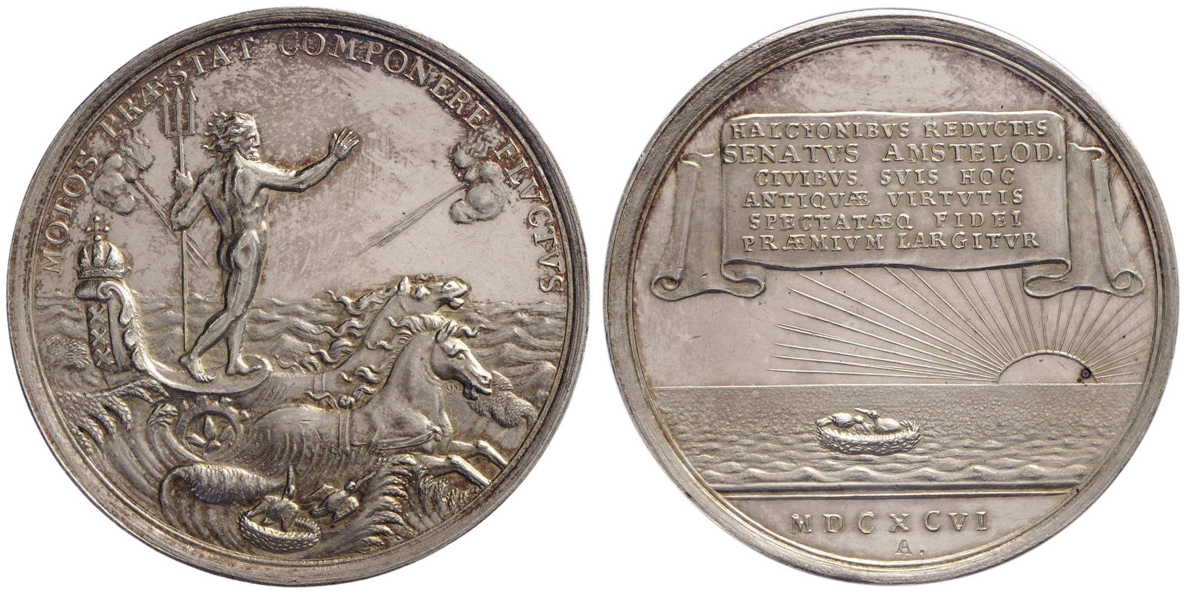 opschrift keerzijde: HALCYONIBVS REDVCTIS SENATVS AMSTELOD CIVIBVS SVIS HOC ANTIQVAE VIRTVTIS SPECTATAEQ FIDEI PRAEMIVM LARGITVR.