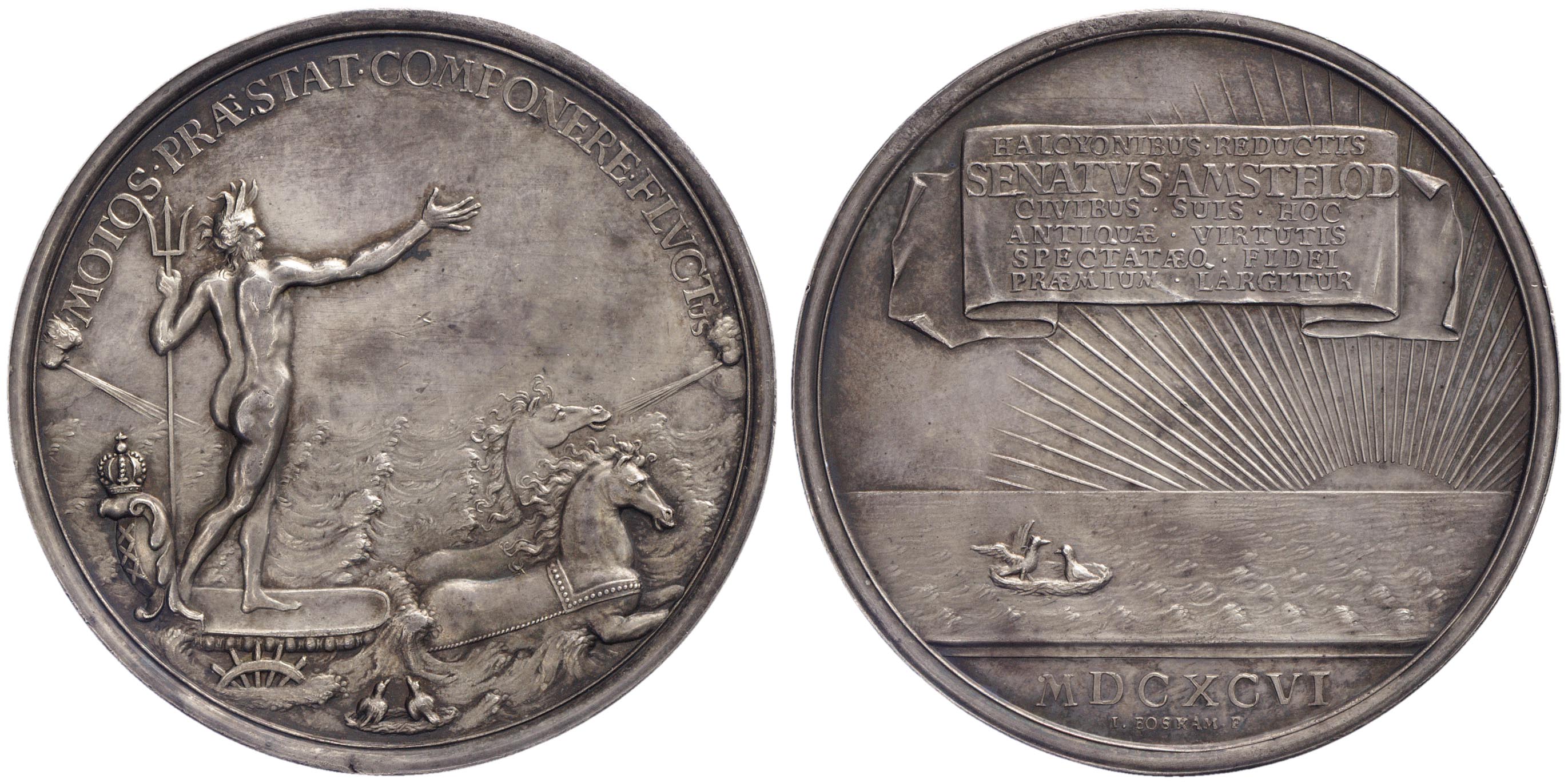voorzijde: Neptunus staande met drietand in de linkerhand op zijn strijdwagen met het gekroonde wapen van Amsterdam, getrokken door twee paarden in een stormachtige zee; de ijsvogels vliegen uit hun nest. De wind blaast in de vorm van twee mensenhoofden. Omschrift.