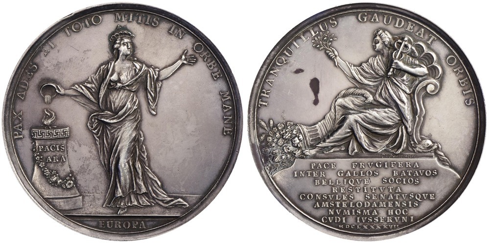 opschrift keerzijde op het voetstuk: PACE FRVGIFERA / INTER GALLOS BATAVOS / BELLIQVE SOCIOS / RESTITVTA / CONSVLES SENATVSQVE / AMSTELODAMENSIS / NVMISMA HOC / CVDI IVSSERVNI / MDCLXXXXVII