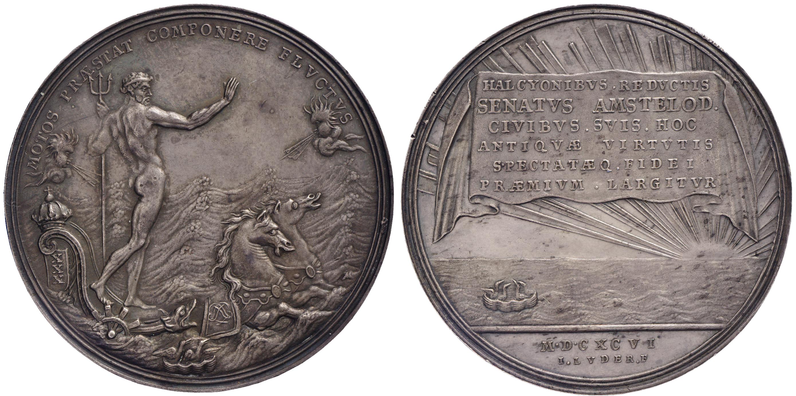 opschrift keerzijde: HALCYONIBUS . REDUCTIS . / SENATUS . AMSTELOD . / CIVIBUS . SUIS . HOC . / ANTIQUAE . VIRTUTIS . / SPECTATAEQ . FIDEI . LARGITUR .