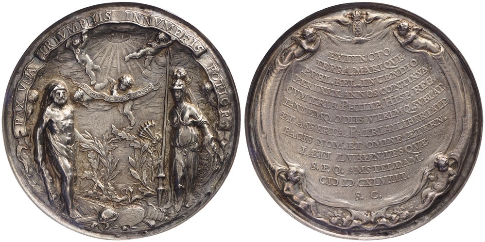 opschrift keerzijde, onder het gekroonde wapen van Amsterdam: EXTINCTO / TERRA MARIQUE / PUBL. BEL. INCENDIO / PER LXXX ANNOS CONTINVA. / CVMTRIB. PHILIP. HISP. REG. / TANDEMQ. ODIIS UTRIMQ. SVBLAT. / ET ASSERTA. PATRIAE LIBERTATE / PACIS NOM. ET OMINE AETERN. / LAETI LVBENTESQUE S.P.Q. AMSTELDAM. MDCXLVIII. / S.C.
