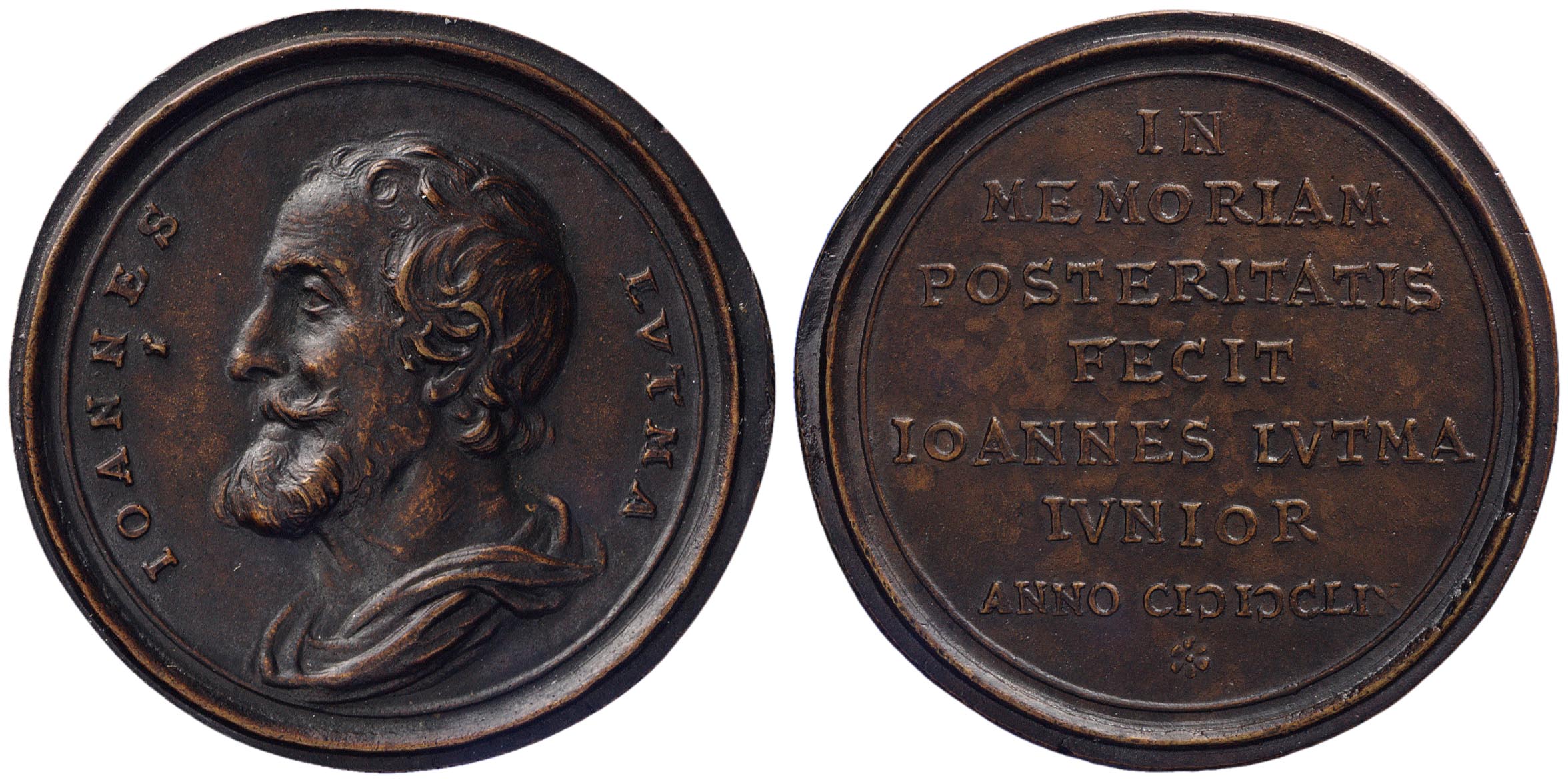 Voorzijde: borstbeeld in profiel naar links van Johannes Lutma de Oude en zijn naam.