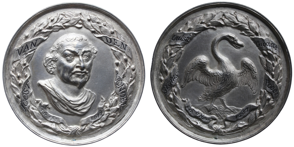 Voorzijde: borstbeeld van Joost van den Vondel à l'antique; daaromheen een lauwerkrans waaromheen een lint gewonden is met opschrift.