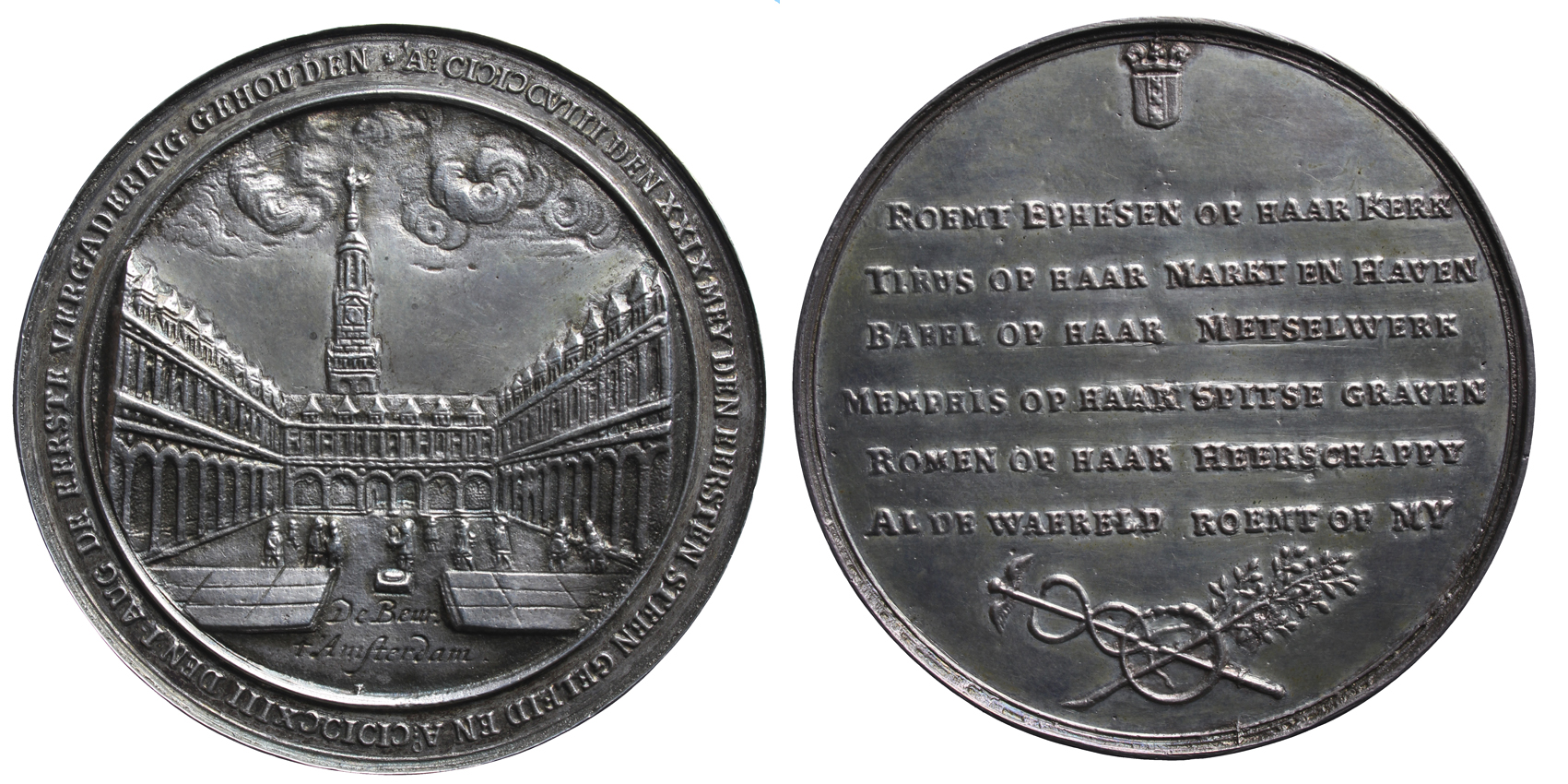 omschrift voorzijde: Ao. M D CVIII, DEN XXIX. MEY DEN EERSTEN STEEN GELEID EN Ao. MDCXIII DEN I. AUG DE EERSTE VERGADERING GEHOUDEN.