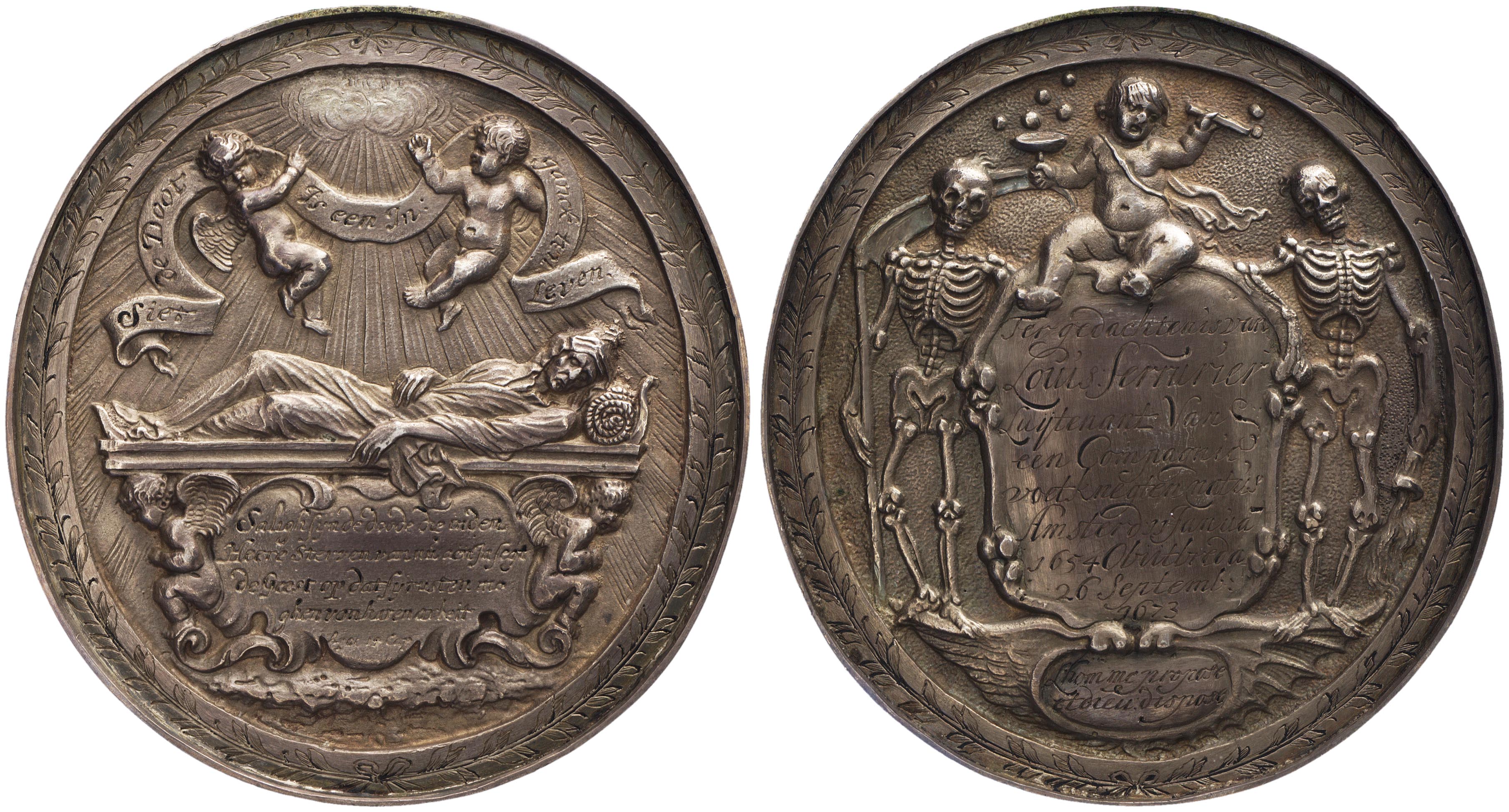 Keerzijde: in het midden een cartouche omlijst door beenderen, vastgehouden door twee skeletten. Het skelet links houdt een zeis vast; het skelet rechts een toorts die omlaag hangt. Bovenop het cartouche zit een bellen blazende putto. In zijn rechterhand een schaal van waaruit zeepbellen opstijgen en in zijn linkerhand een blaaspijp. Hij draagt een sjerp en achter hem bolt een cape op. Daaronder een kleinere cartouche met links een engelenvleugel en rechts een vleermuisvleugel waarop de skeletten staan. Om de rand lauriertakken, onder samengebonden in een strik.