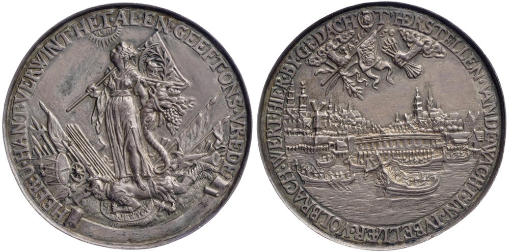 keerzijde: een touwcirkel en een omschrift. Een stralenkrans met het tetragram van Jahweh boven de zegenpralende Vredesmaagd die met vaandel en hoorn des overvloeds (Pax) boven de gevallen strijder (Ares) staat. Rond hem wapentuig. Onder de strijder een signatuur. Onderaan een banderol zonder opschroft.