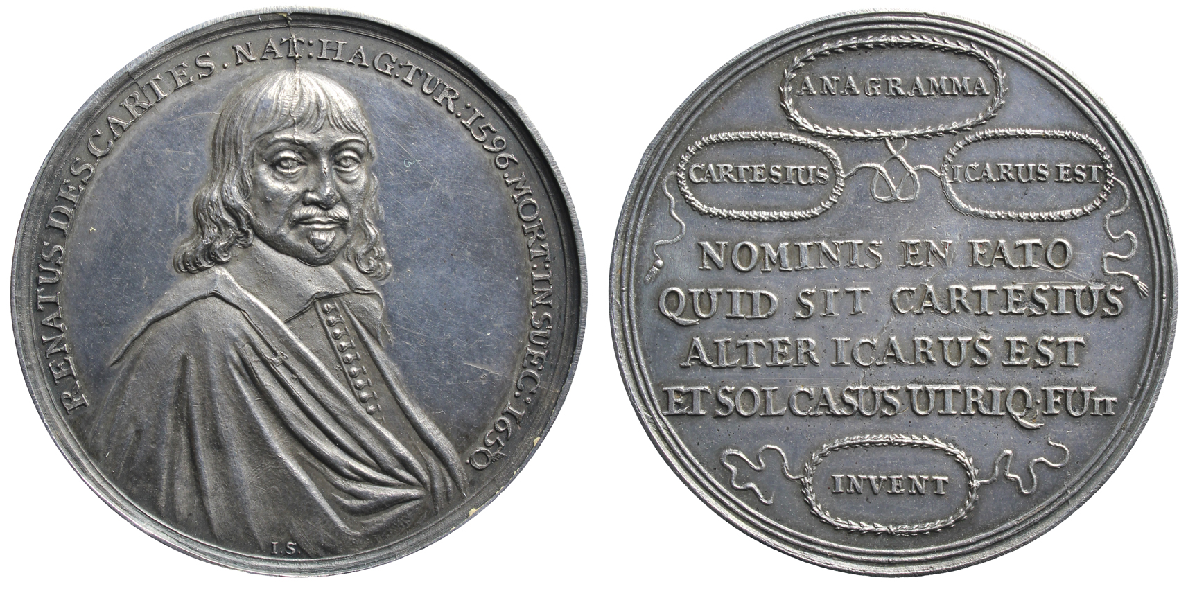 opschrift keerzijde: ANAGRAMMA / CARTESIUS / ICARUS EST / NOMINIS EN FATO / QUID SIT CARTESIUS / ALTER ICARUS EST / ET SOL CASUS UTRIQ FU IT / INVENT