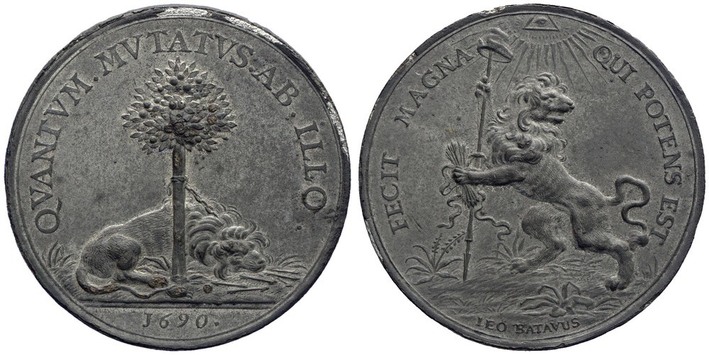 keerzijde: in een opschrift een oranjeboom waaraan een slapende leeuw met een ketting gebonden ligt. Voor hem liggen losse pijlen uit de pijlenbundel. In de afsnede een jaartal.