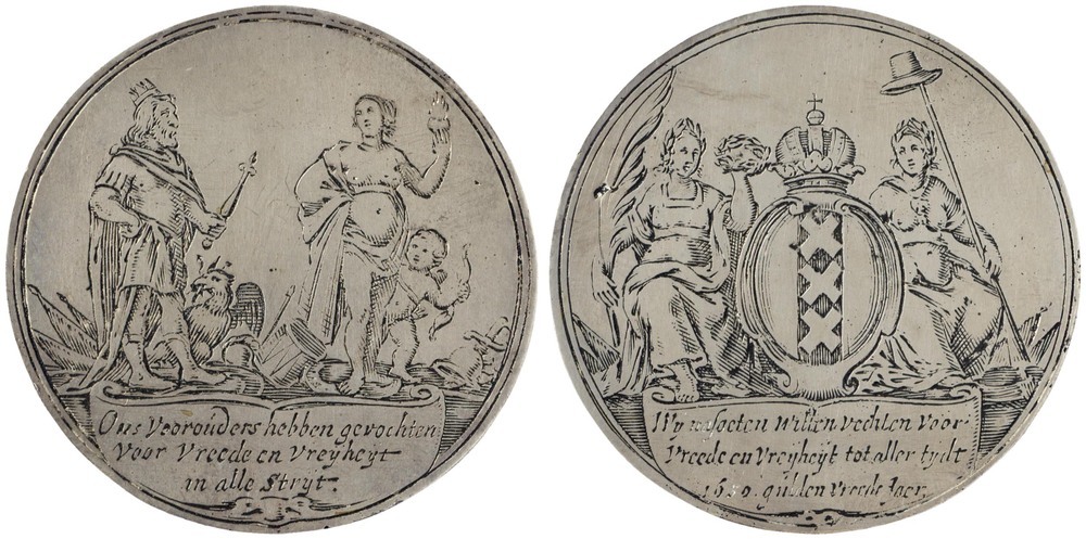 opschrift keerzijde: Wy nasaeten willen vechten voor / Vreede en Vreijheijt tot aller tydt / 1650 gulden Vreede Jaer