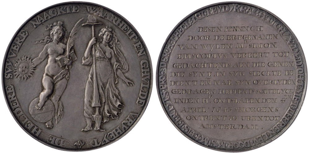 opschrift keerzijde: DESEN PENNINGH / DOOR DE ERFGENAMEN / VAN WYLEN Mr. SIMON / EPISCOPIUS VEREERT TOT / GEDACHTENIS AEN DIE GENEN / DIE SYN E. IN SYN SIECKTE BE / DIENT EN NAE SYN OVERLYDEN / GEDRAGEN HEBBEN IS SOETELYCK / IN DEN Hr. ONTSLAPEN DEN 4en / APRIL 1645 SMORGENS / OMTRENT 10 UREN TOT / AMSTERDAM .