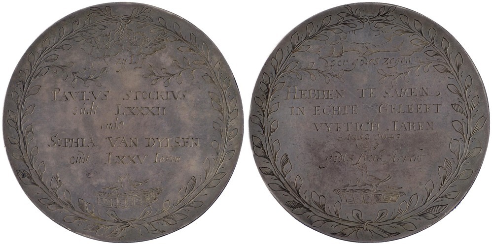 opschrift keerzijde: HEBBEN TE SAMEN / IN ECHTE GELEEFT / VYFTICH IAREN / Anno 1648 / godst stock sterckt