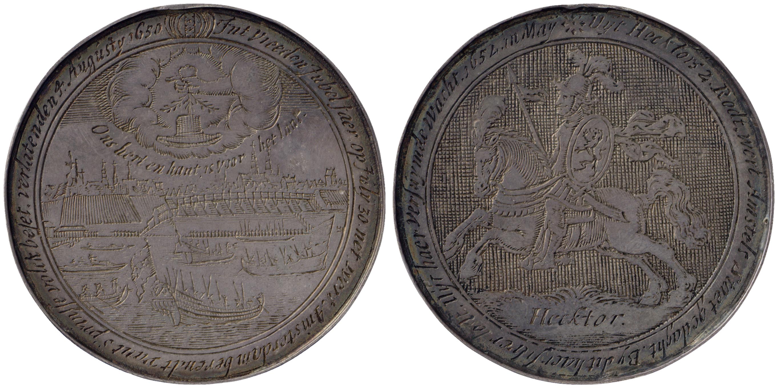 omschrift keerzijde: Uyt Hecktors 2 Rodt, wert Amstels Staet gedaght. By dit haer silver lodt Uijt haer Versúymde Wacht. 1654 in Maij