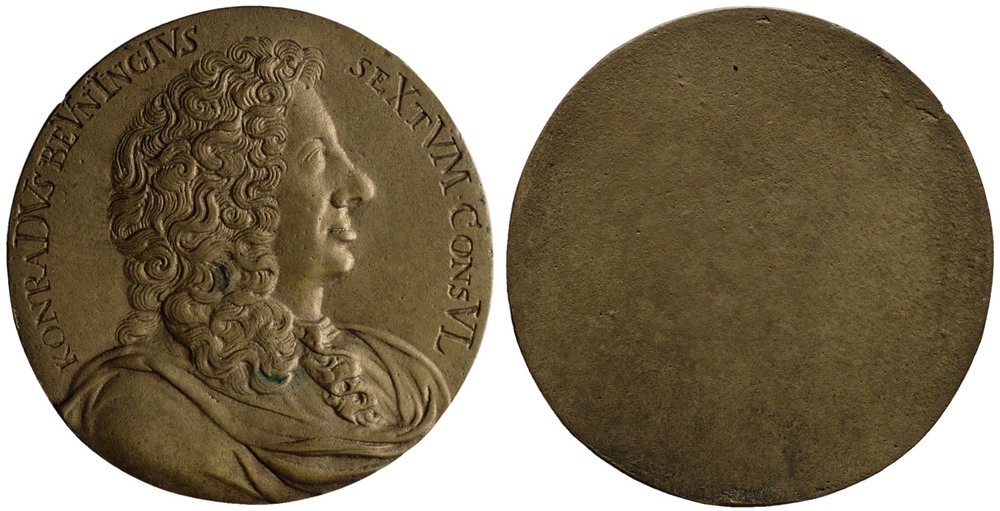 Coenraad van Beuningen (1622-1693) zesmaal burgemeester van Amsterdam, diplomaat, 1687 koper, metaal hoogte: 4.2 cm; breedte: 4.2 cm; diepte: 0.2 cm; gewicht: 20.30 gr; omschrift voorzijde: konraDVs beVnIngIVs seXtVM ConsVL