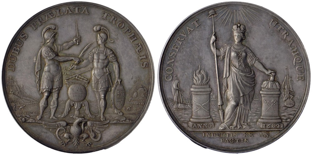 penning op het Twintigjarig Bestand tussen Frankrijk, Spanje en de Nederlanden, te 's Gravenhage gesloten en bevestigd te Ratisbonne (Regensburg). Geslagen in opdracht van de Stad Amsterdam, 1684.