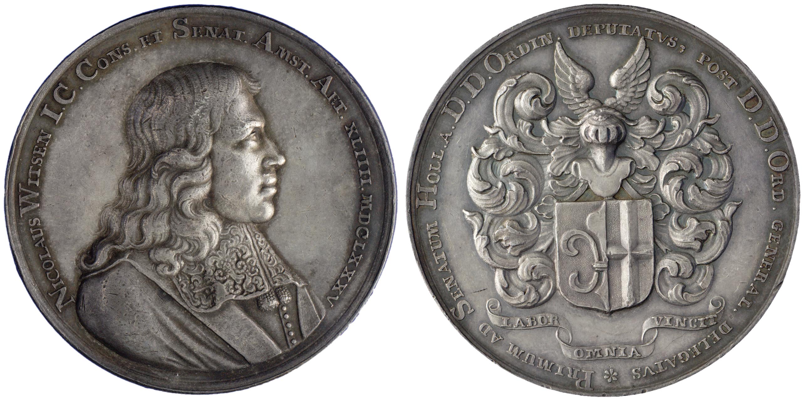 omschrift voorzijde: NICOLAUS WITSEN I . C . CONS . ET . SENAT . AMST . AET . XLIIII . MDCLXXXV