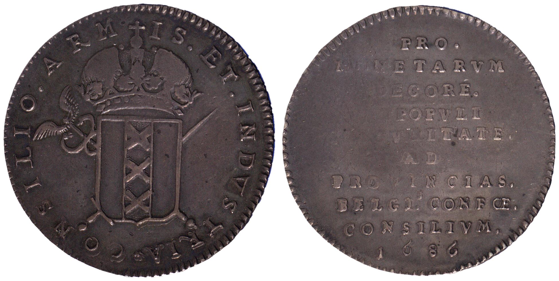 opschrift keerzijde: PRO / MENETARVM / ...DECORE / ...POPVLI / ...VALTATE / AD / PROVINCIAS. / BELGI. CONFOE. / CONSILIVM, / 1686