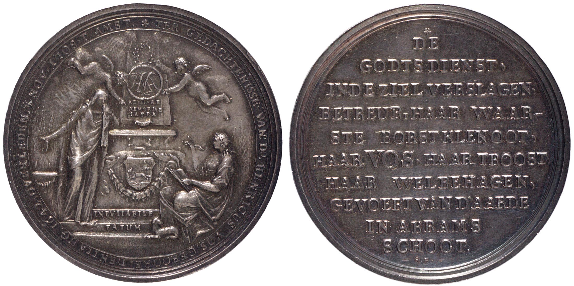 omschrift voorzijde: TER GEDACHTENISSE VAN DO. HENRICUS VOS, GEBOORE DEN 17 AUG. 1642, OVERLEDEN 5 NOV. 1708 T AMST. *