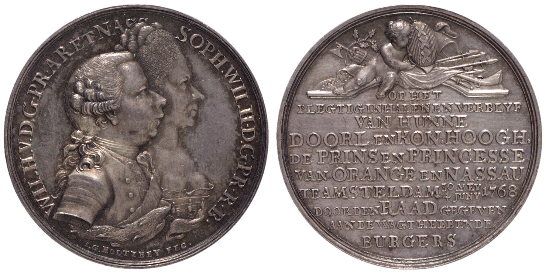 opschrift keerzijde: OP HET / PLEGTIG INHALEN EN VERBLYF / VAN HUNNE / DOORL. EN KON. HOOGH. / DE PRINS EN PRINCESSE / VAN ORANGE EN NASSAU / TE AMSTERDAM 30 MEY-1 JUNY 1768 / DOOR DEN RAAD GEGEVEN / AAN DE WAGTHEBBENDE / BURGERS.