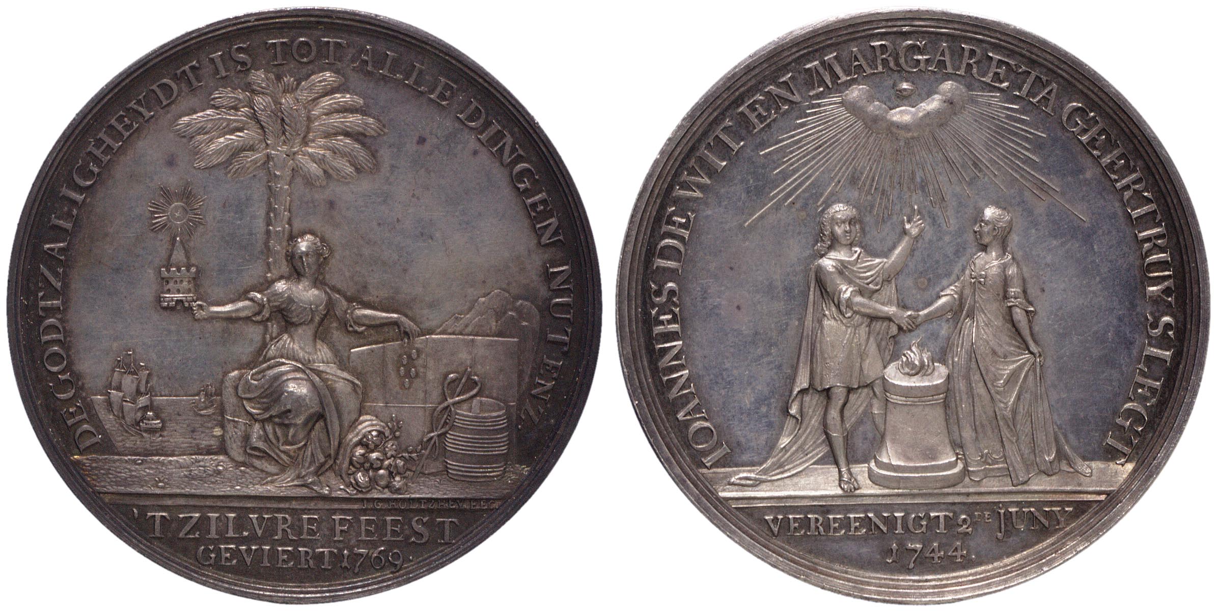 opschrift voorzijde in de afsnede: 'T ZILVRE FEEST / GEVIERT 1769.