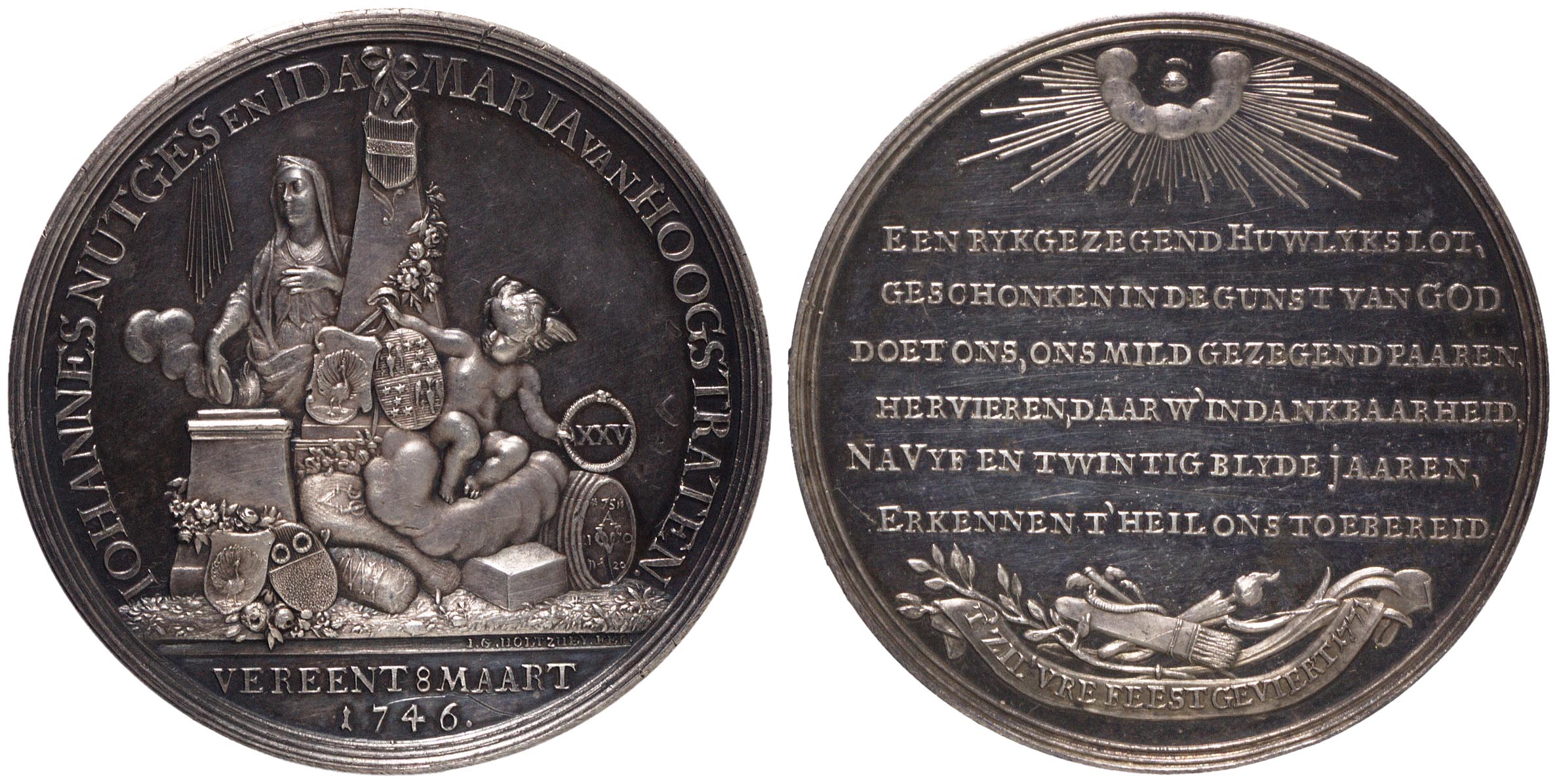opschrift keerzijde: EEN RYKGEZEGEND HUWELIJKSLOT, / GESCHONKEN IN DE GUNST VAN GOD. / DOET ONS, ONS MILD GEZEGEND PAAREN, / HERVIEREN, DAAR W’IN DANKBAARHEID, / NA VYF EN TWINTIG BLYDE JAAREN, / ERKENNEN T’ HEIL ONS TOEBEREID.