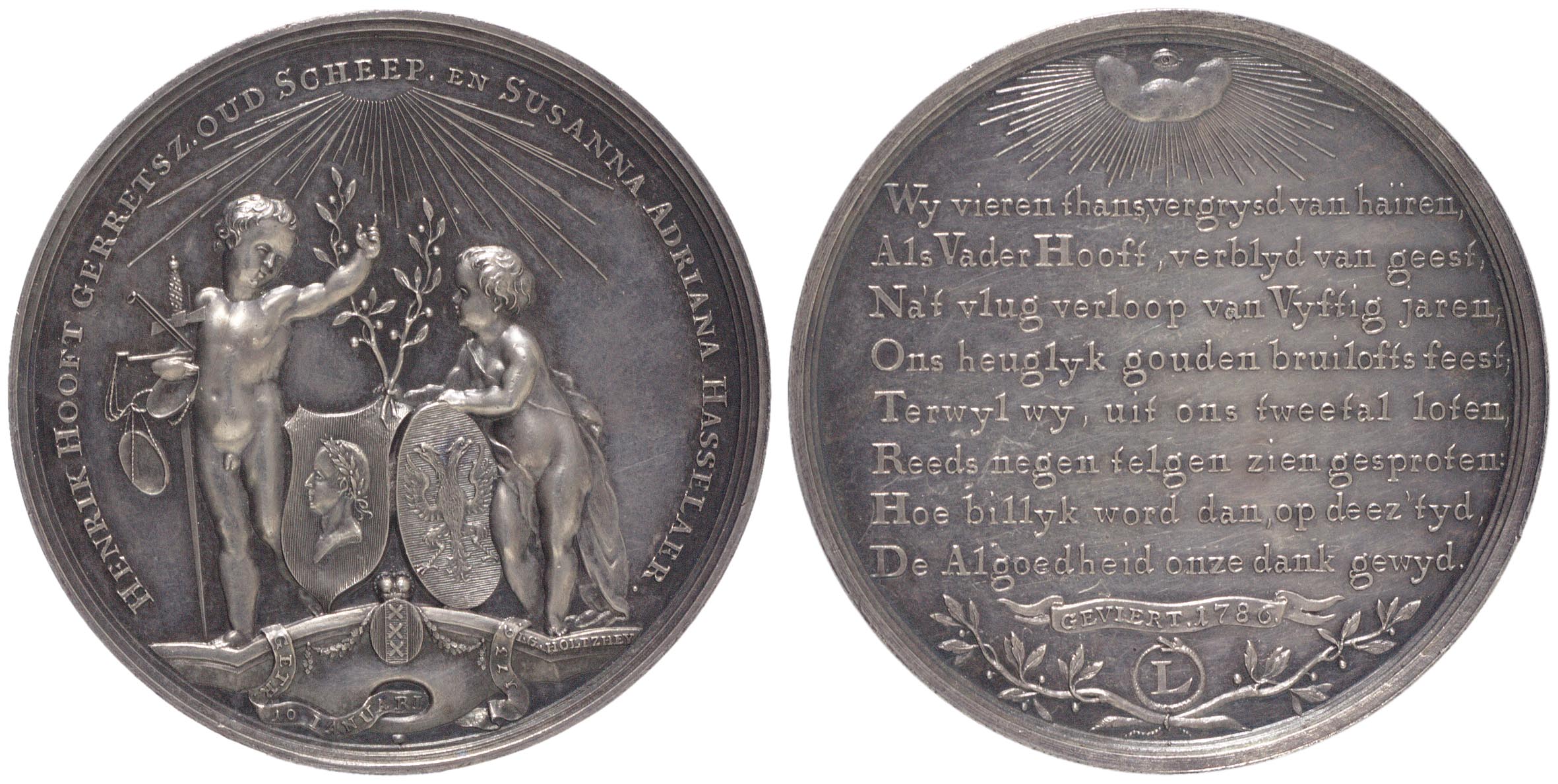opschrift keerzijde: Wy vieren thans, vergrysd van hairen / Als Vader Hooft, verblyd van geest, / Na 't vlug verloop van Vijftig jaren, / Ons heuglyk gouden bruilofts feest, / Terwyl wy , uit ons tweetal loten / Reeds negen telgen zien gesproten / Hoe billyk word dan, op deez’ tyd, / De Algoedheid onze dank gewyd.