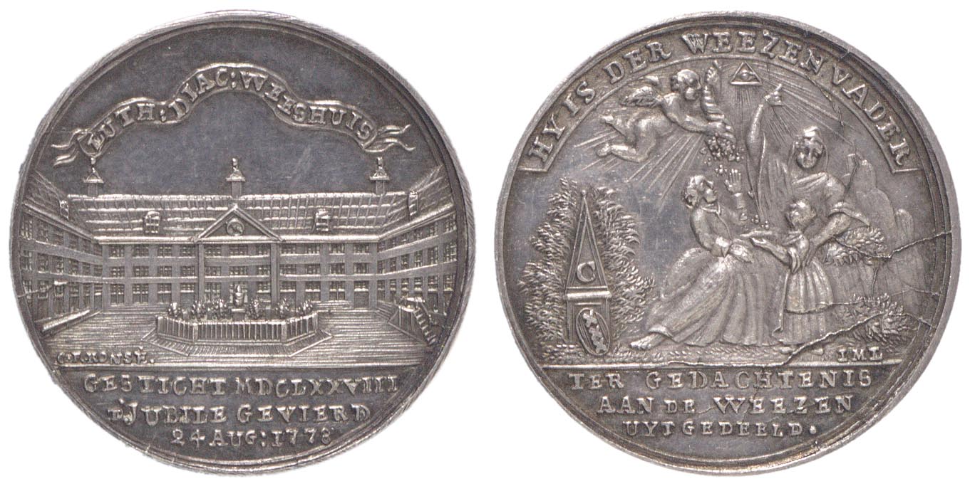 opschrift keerzijde in de afsnede: TER GEDACHTENIS / AAN DE WEEZEN / UYT GEDEELD.