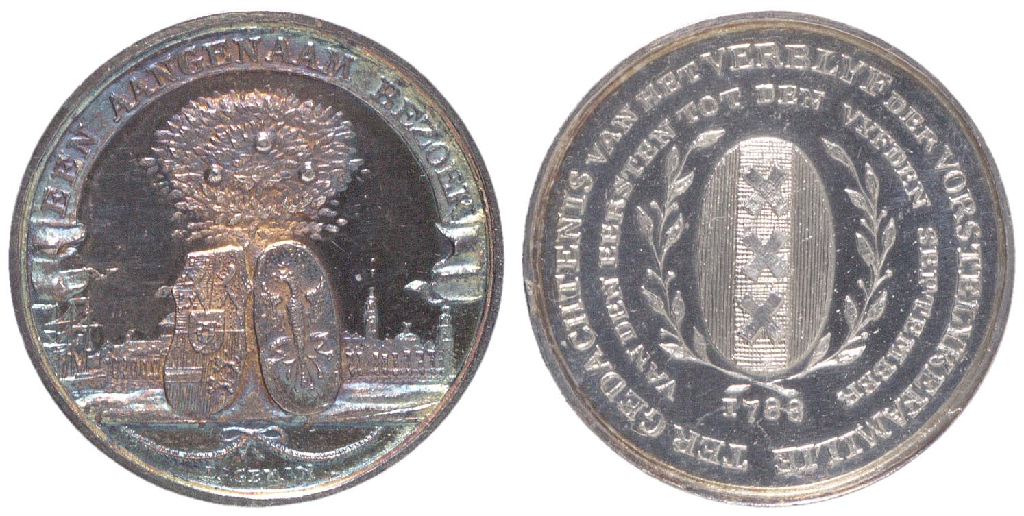 omschrift keerzijde: TER GEDACHTENIS VAN HET VERBLYF DER VORSTELYKE FAMILIE / VAN DEN EERSTEN TOT DEN VYFDEN SEPTEMBER / 1788