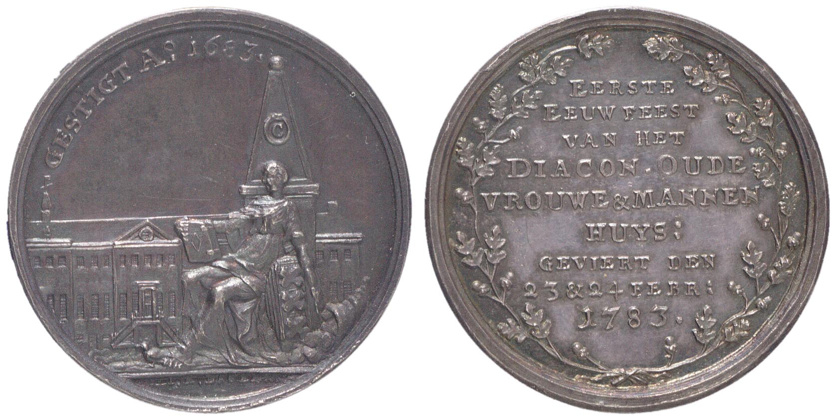 opschrift keerzijde: EERSTE / EEUWFEEST / VAN HET / DIACON: OUDE / VROUWE & MANNEN / HUYS: / GEVIERT DEN / 23 & 24 FEB / 1783