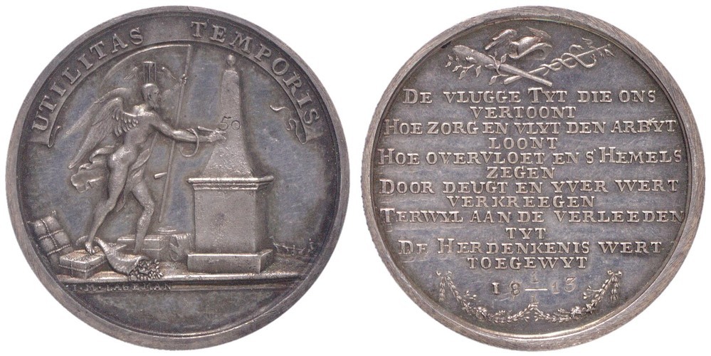 opschrift keerzijde: De vlugge Tyt die ons / vertoont / Hoe zorge en vlyt den arbyt / loont / Hoe overvloet en s'Hemels / zegen / Door deugt en yver wert / verkreegen / Terwyl aan de verleeden / tyt / De Herdenkenis wert / togewyt / 18 1-1 13