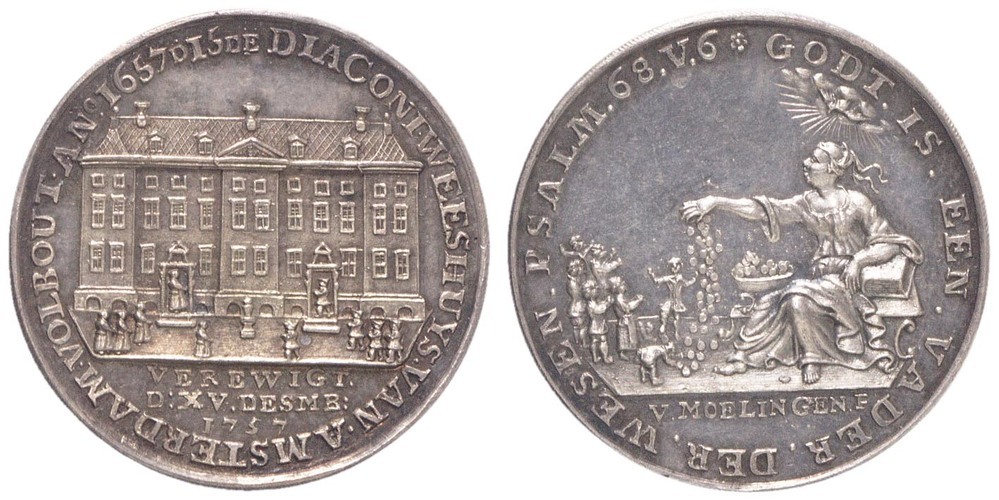 voorzijde: in een omschrift de gevel van het Diaconieweeshuis van Amsterdam met links de meisjesvleugel en rechts de jongensvleugel. Centraal staat de armenbus. In de afsnede een opschrift.