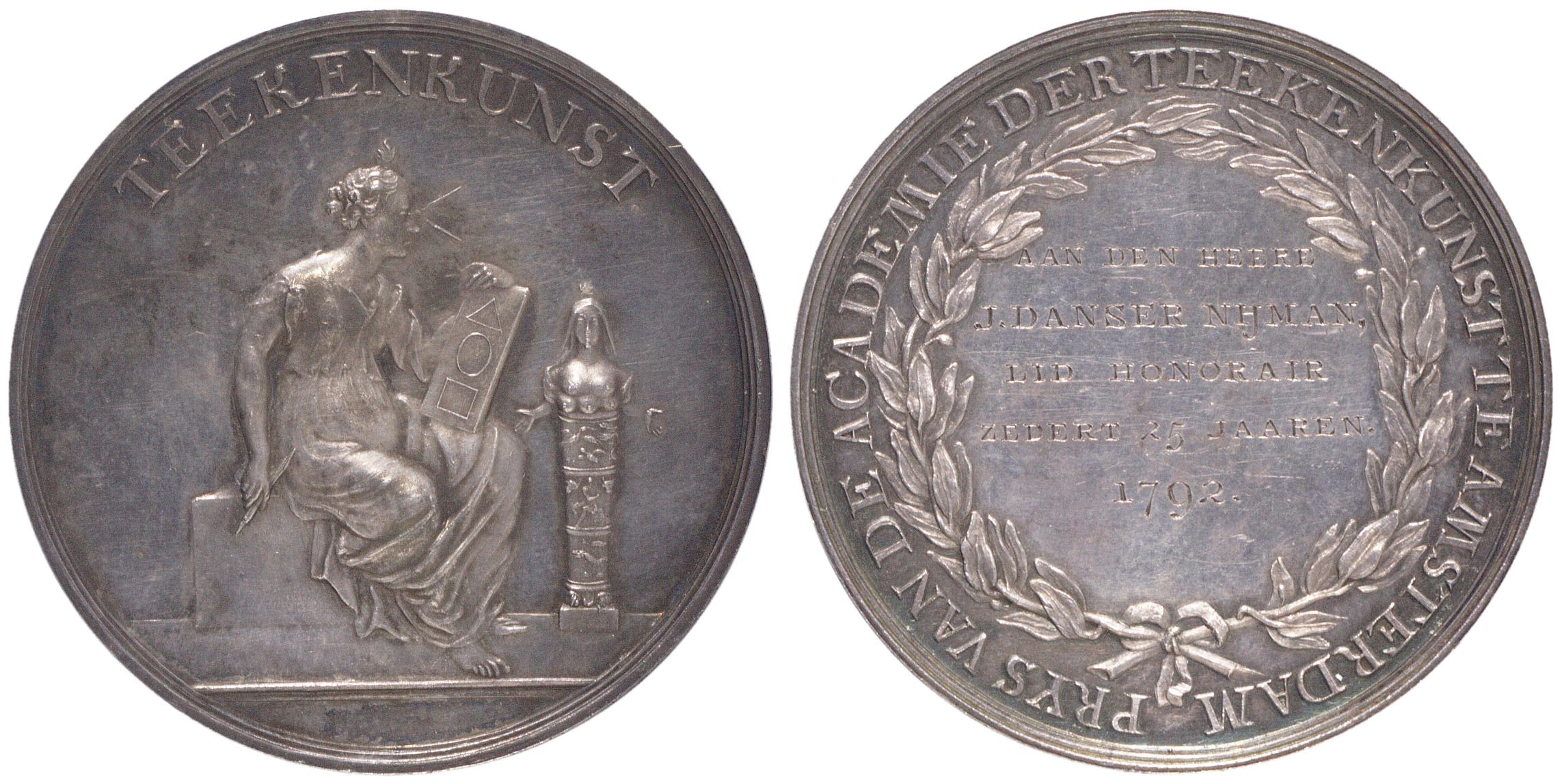 opschrift keerzijde: AAN DEN HEERE / J. DANSER NIJMAN, / LID HONORAIR / ZEDERT 25 JAAREN. / 1792.