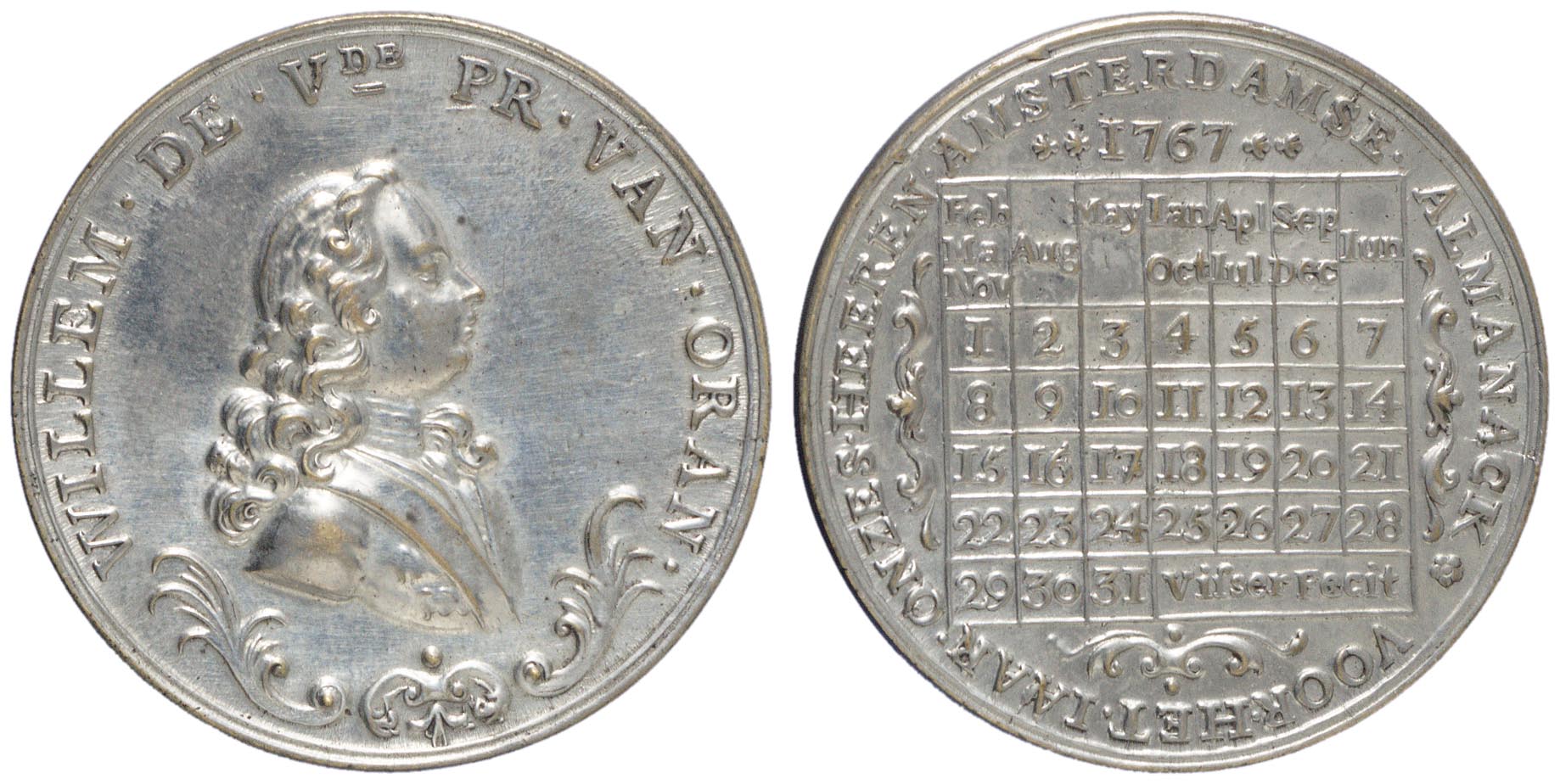 keerzijde: een omschrift waarbinnen een vierkant met vakken waarin de de maanden en dagen staan; inhet laatste vakje rechtsonder een signatuur. Boven het vierkant het jaartal 1767.