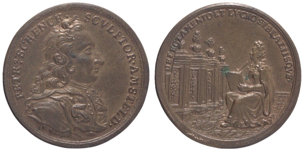 Keerzijde: de vrouwelijke personificatie van de graveerkunst zit in antiek gewaad in een ruimte. Zij wendt zich naar links waar op vier zuilen naast elkaar vier antieke portretbuses bevinden. Van de linker portretbuste is alleen de toga te zien. Op de zijkant van de zuilen is een druiventros te zien. De vrouw heeft in haar linkerhand een koperplaat, in haar rechterhand een graveerstift. Zij bestudeert de portretbustes. Achter haar een gordijn. De vloer is een in geometrische patronen uitgevoerde tegelvloer. Omschrift.