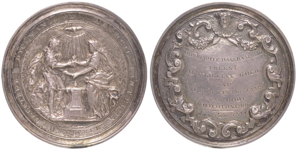 opschrift keerzijde: GODVRUGHTE DANKBAARHEID / ERKENT / AL 'T LIEFLYK GOED / NU / VYF EN TWINTIG JAAR / VAN GODT / IN D' ECHT ONTMOET / den 16 Julius 1702
