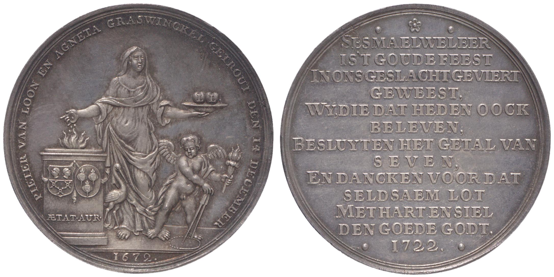 opschrift keerzijde: ses mael weleer / is 't goude feest / in ons geslacht geviert / geweest / wy, die dat heden oock / beleven / besluyten het getal van / seven / en dancken voor dat / seldsaem lot / met hart en siel / den goede godt / 1722