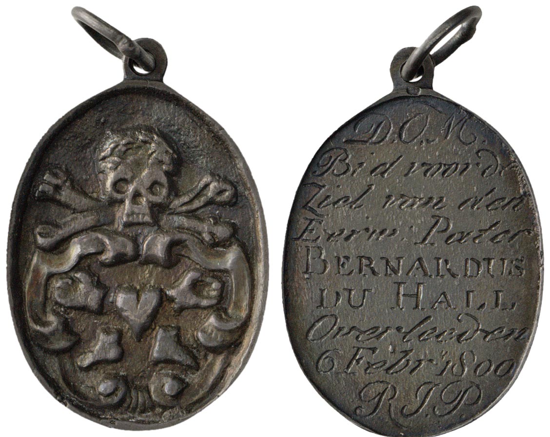opschrift keerzijde: D.O.M. / Bid voor de / Ziel van den / Eerw. Pater / BERNARDUS / DU HALL / Overleeden / 6 Febr 1800 / R.I.P.