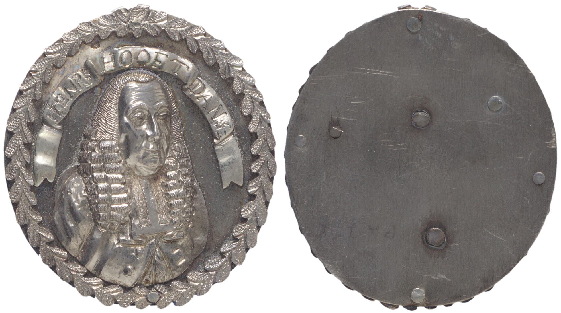 voorzijde: in een lauwerkrans het borstbeeld van H.D. Hooft, naar rechts gewend, met pruik, bef en mantel; boven het borstbeeld een banner met opschrift. Opgelegd reliëf, krans en banner. keerzijde: onbewerkt.- Trefwoorden