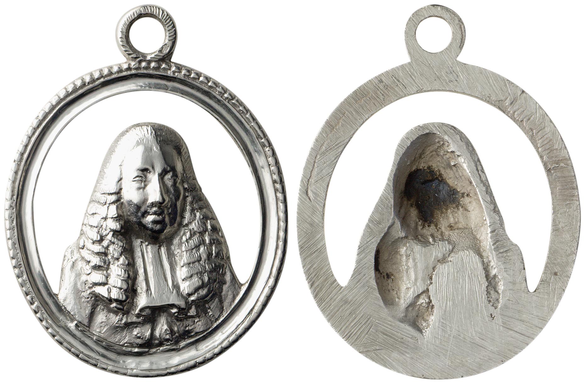 voorzijde: het gedreven, opengewerkte borstbeeld van H.D. Hooft naar rechts gewend, met pruik, bef en mantel in een lijst met parelrand. Bovenaan de penning een oog. keerzijde: onbewerkt.- HerkomstSchenking G.A. Heineken, Amsterdam, 1885.