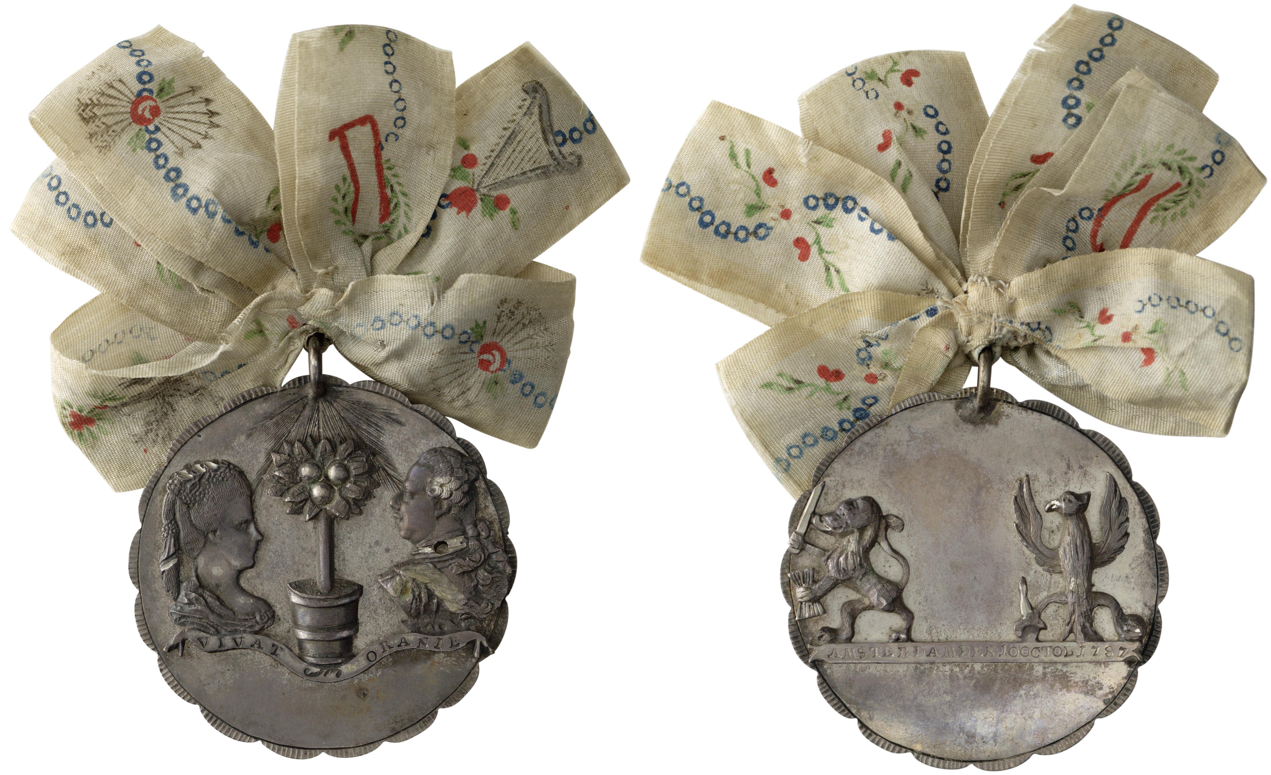 Dit draagteken van de orangisten is gemaakt ter herinnering aan het hertel van het gezag van stadhouder Willem V in 1787. Op de voorkant is een oranjeboompje te zien met aan weerszijde de portretten van Willem V en zijn vrouw Wilhelmina van Pruisen. op de achterkant zijn een leeuw en een adelaar te zien, symbool voor respectievelijk het Huis van Oranje en het koningshuis van Pruisen. ( Daphne Willemsen)