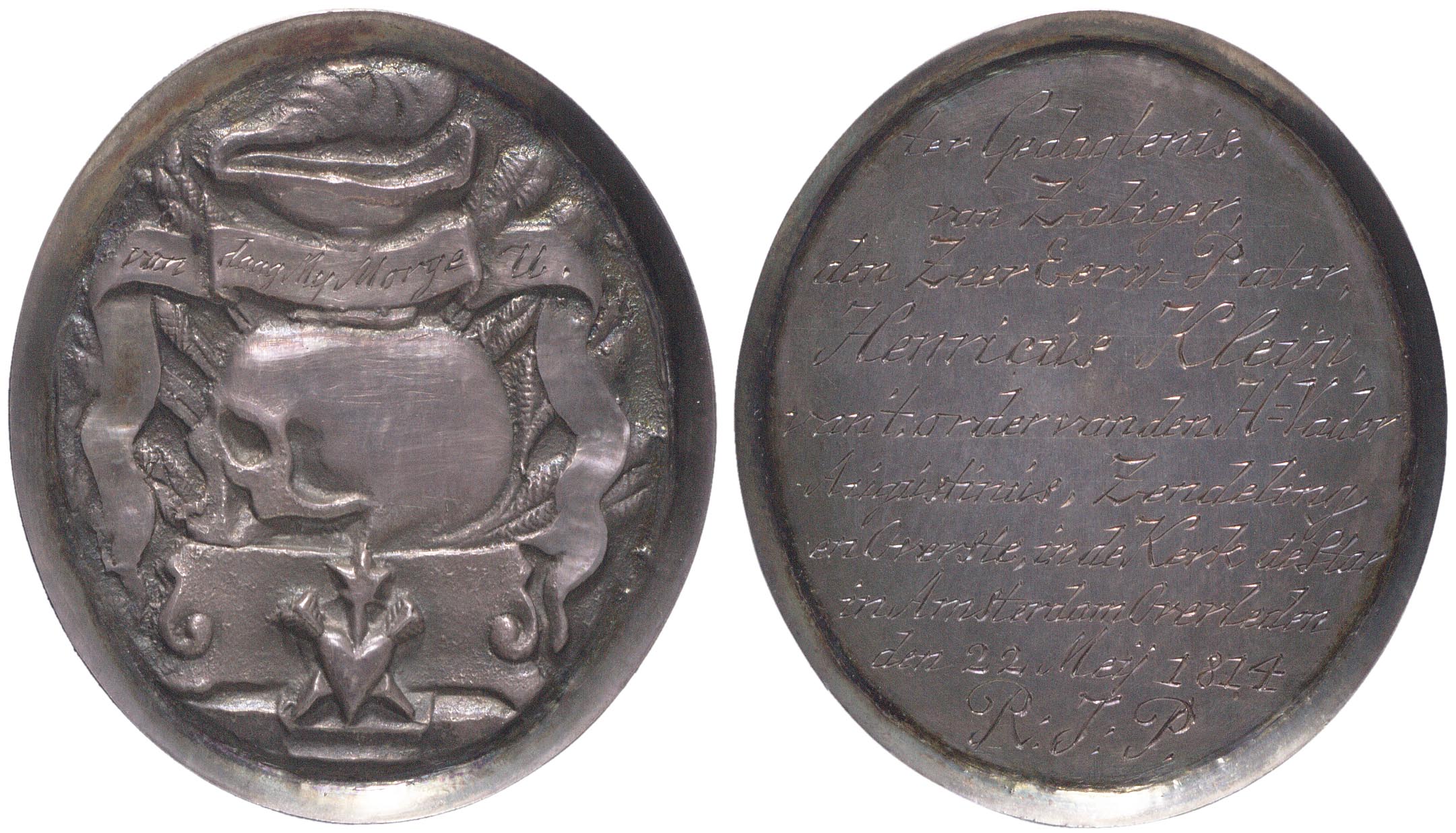 opschrift keerzijde: ter Gedagtenis / van Zaliger / den Zeer Eerw. Pater / Henricus Kleijn / van't Order vanden H. Vader / Augustinus, Zendeling / en Overste, in de Kerk de Star / in Amsterdam Overleden / den 22 Meij 1814 / R.I.P.