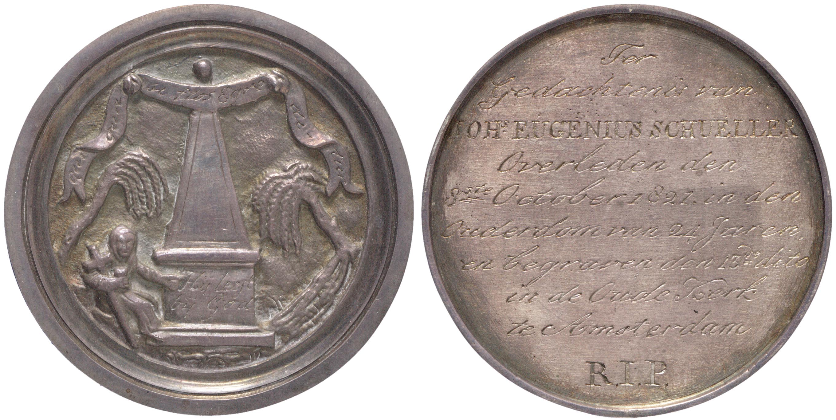 opschrift keerzijde: Ter / Gedachtenis van den / JOHS EUGENIUS SCHUELLER / Overleeden den / 8ste October 1821 in den / Ouderdom / van 24 Jaren / en begraven den 13dedito / IN DE OUDE KERK / te / Amsterdam / R.I.P.